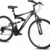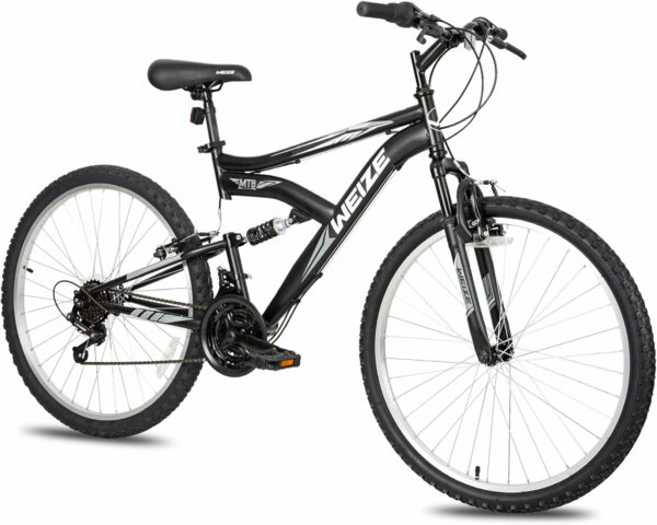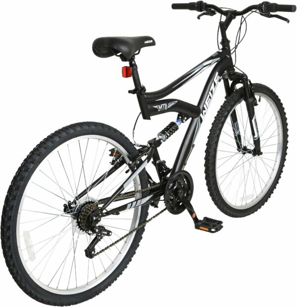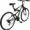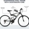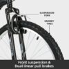 Durable steel dual suspension Mountain Bike frameFront suspension fork and rear coil shock18 speed twist shifters with rear derailleurFront and rear linear pull brakesAlloy rims and three-piece cranksAssembled Dimensions: 69″ L x 42.51″ H x 24.4″ WSupports Maximum weight of 275 lbs.Male Rider Height: 5’2″ – 6’2″