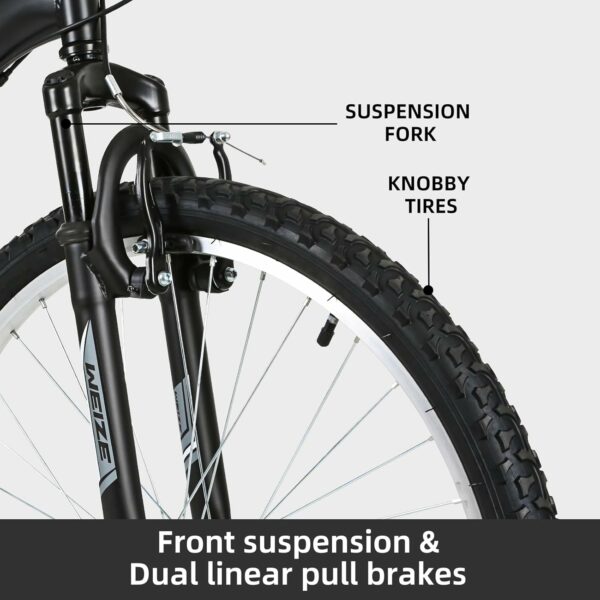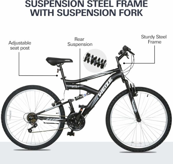 【Frame】: Durable steel dual suspension Mountain Bike frame. Featured with Front suspension fork and rear coil shock to smooth out the bumps along the way.