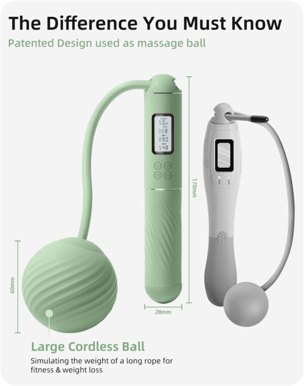 2.Patented 2In 1 Design for Stability: Our innovative design includes a large cordless ball that ensures the rope won’t easily fall. The external thread of the ball doubles as a massage ball, simulating the weight of a long rope for fitness and weight loss. Additionally, two removable counterweights enhance fat burning and accelerate sweating.