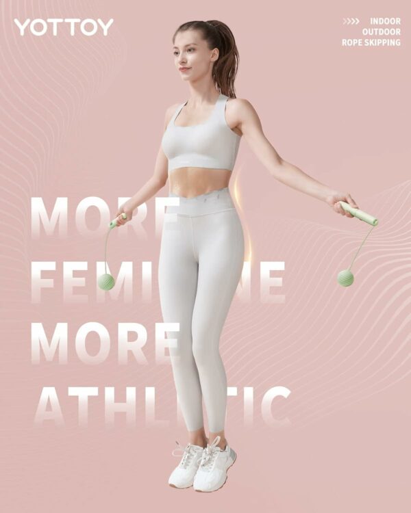 YOTTOY, established in 2012, is a popular sports brand among young people, driven by a passion for yoga culture and craftsmanship. We blend fashion, technology, and modern culture into our women’s yoga products to provide comfort, enhance physical fitness, and elevate personal style. Our jump rope with a built-in counter features a large LED display that shows real-time data, including time, weight, calories, and reps. When you reach your target, the rope emits a “didi” sound. We utilize a high-precision chip for accurate data tracking. Our patented design includes a large cordless ball that is highly stable and won’t easily fall. The ball’s weight simulates that of a long rope, making it perfect for fitness and weight loss. Moreover, the surface of the ball has threads that can be used as a massage ball to relieve soreness. If you desire additional weight, we provide two removable counterweights, allowing you to maximize calorie burning with a weighted jump rope. Our speed jump rope utilizes premium 360-degree ball bearings, ensuring stable, fast, and tangle-free rotation. The adjustable steel rope with PVC protection guarantees durability and prevents cracking or breaking. Experience the smoothest jumps with our latest rope, enabling faster and smoother workouts. Safety and comfort are paramount to us. The handle is made of high-quality, non-polluting silicone, providing an ergonomic, non-slip grip. It is non-toxic, odorless, and ensures safe use. The comfortable hand grip reduces fatigue and makes it easier to exert force during your workouts. Revolutionize your workout with our YOTTOY Weighted Jump Rope for Women. Easily switch between cordless and corded options, allowing for jump rope training anytime, anywhere. Suitable for all ages and fitness levels, it’s perfect for use in small spaces like offices, bedrooms, and living rooms. Stay in shape with this versatile YOTTOY jump rope.