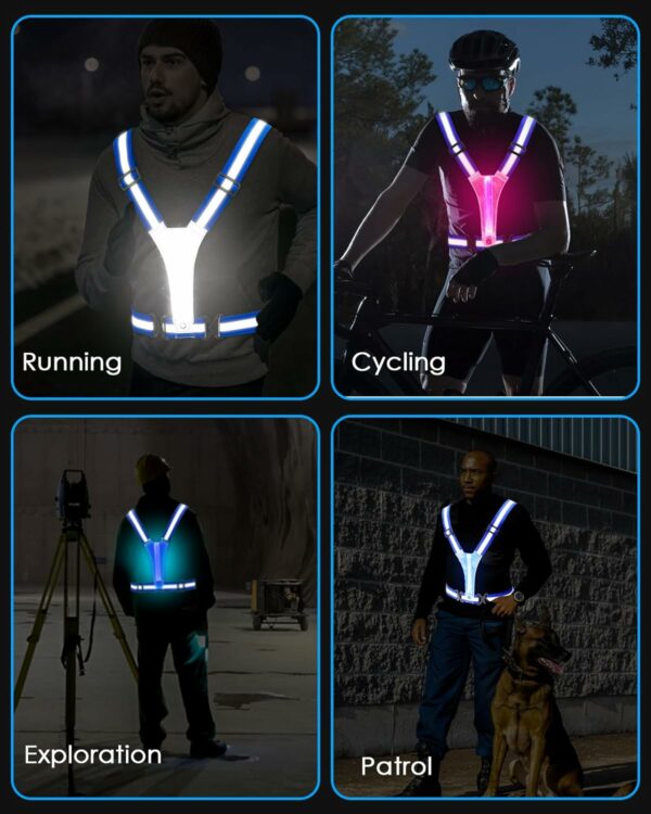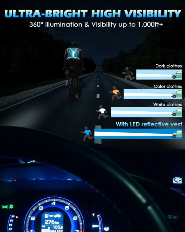 【Stay Safe, Stay Visible with High Visibility】: This LED reflective vest uses top-tier LED lights and reflective strips, 360° lighting at night to ensure your safety, even in the harsh environment of 1000 feet away. And keeping you seen and safe during low-light outdoor activities with the reflective running vest